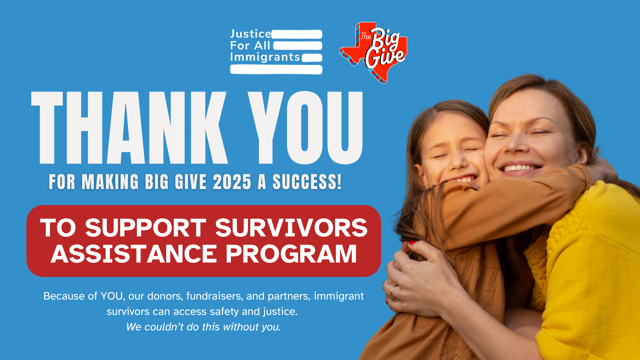| | Thank You for a Successful Big Give! We are thrilled to share that this year’s Big Give was a success, thanks to the incredible generosity of our supporters and the dedication of our peer-to-peer fundraisers. Together, we raised funds to support immigrant survivors of domestic and gender-based violence and their families. Your contributions make it possible for JFAI to provide free and low-cost legal services, protection, and stability to those who need it most. We are deeply grateful to everyone who gave, shared our mission, and helped spread the word. A special thank you goes to our amazing peer-to-peer fundraisers, who rallied their networks and brought new energy and supporters to JFAI. We couldn’t have done it without you, and we can’t wait to see you again for Big Give 2026! 🔗 Visit our Big Give profile, follow us on Facebook, Instagram, and help spread the word. |